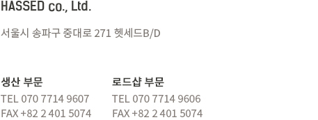 사업자 주소 : 경기도 남양주시 수동면 모꼬지로 277-4  |  TEL 02-401-5077 |  FAX 02-401-5078  |  E-MAIL : hassed_kr@naver.com   © 2010-2026 (주)헷세드 All Rights Reserved.